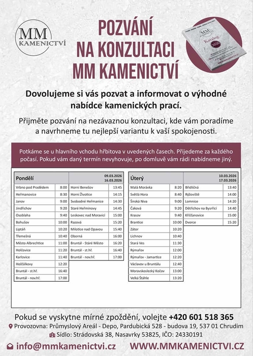 Dne 10.3. v 9:00 hod. bude na místním hřbitově v Široké Nivě poskytovat své kamenické služby firma MM KAMENICTVÍ s.r.o.