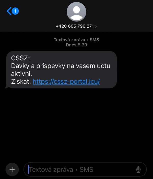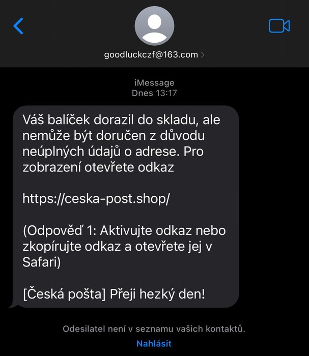 Náhled na podvodnou sms s vyzvednutím balíčku